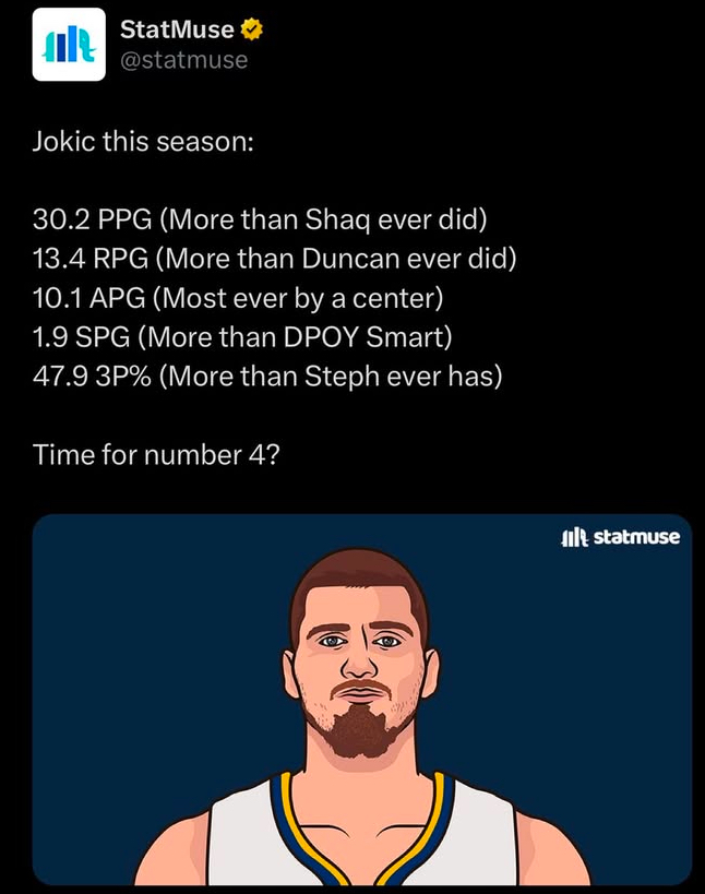 He currently sits second behind Gilgeous-Alexander in the MVP race. This season, Jokic is averaging 30.2 points, 13.4 rebounds, and 10.1 assists for the Nuggets, who have climbed to fourth place in the Western Conference standings. According to Basketball Reference, Jokic leads Gilgeous-Alexander in Player Efficiency Rating, Win Shares, Field Goal Percentage, and Three-Point Field Goal Percentage. This suggests that voters may be valuing team success more than usual, as Oklahoma City sits at 36-8 while Denver is 28-16. But this raises questions about